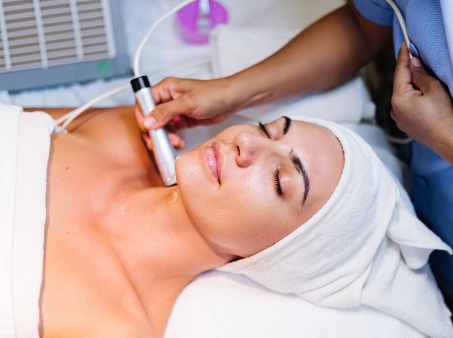 Microdermabrasion facial treatment that gently exfoliates the skin, removing dead cells to reveal a smoother, brighter complexion.